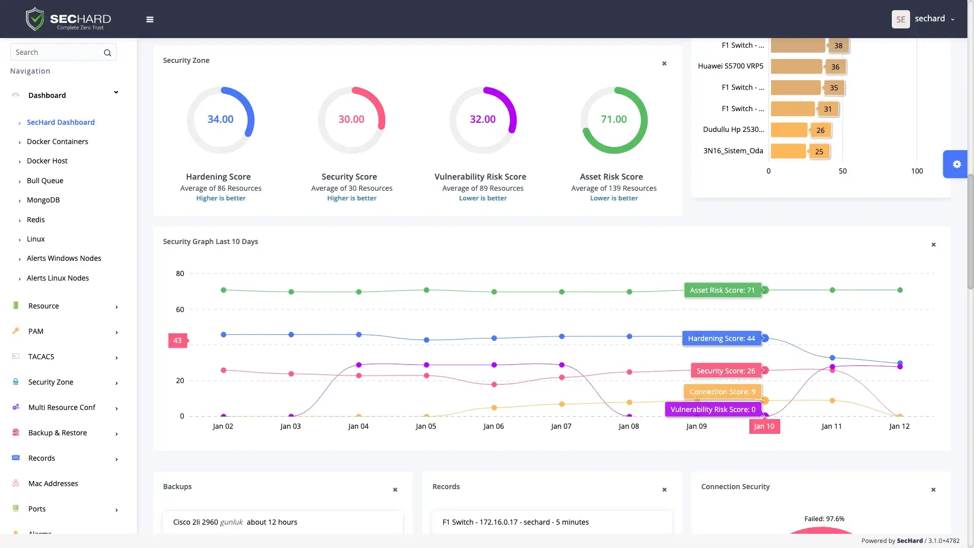 SecHard benzersiz risk tespit formülü sayesinde, varlık grubu risk puanlarını, güvenlik sıkılaştırma puanlarını ve zafiyet puanlarını birleştirir.